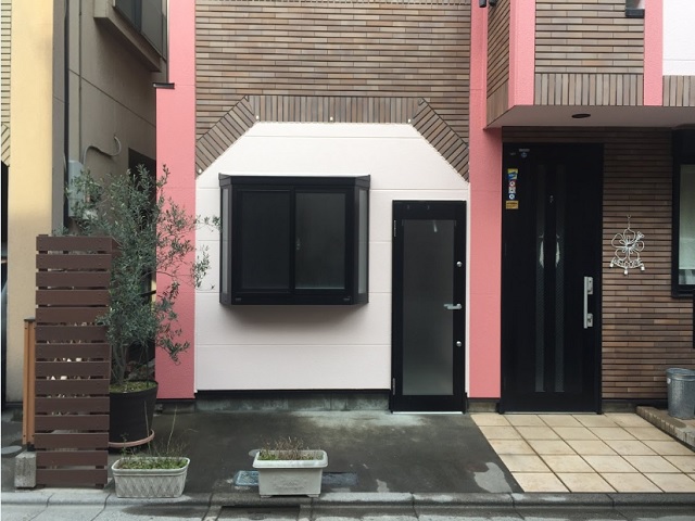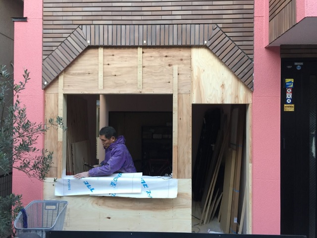 木工事にて駐車場入り口に壁を造作し、さらに出窓とドアを取り付けます。