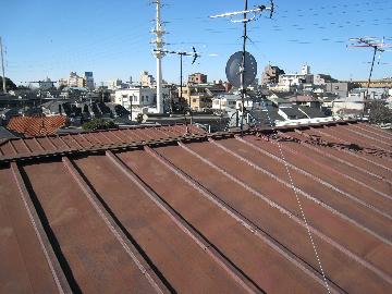屋根の鋼板に錆が出ています。放置しておくと腐食が広がり雨漏りの原因になります。屋根や庇に鋼板が使用されている場合は、危険のない範囲で鋼板部分を確認し、劣化が見られる場合は、その程度により、塗装または鋼板の葺き替えが必要になります。早めに対処すればコストは比較的抑えられます。見えない部分ははしご等を使用し確認致します。