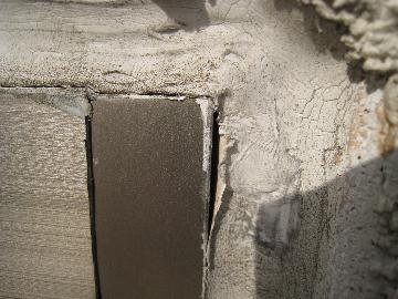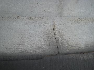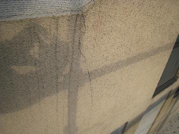 モルタル塗り外壁の亀裂です。大きい亀裂や、亀裂がたくさんあると壁の内部に雨水が浸入する可能性があります。家の内部に水のしみた跡などがある場合はすぐに専門業者に確認してもらいましょう。早期に補修をすると、建物への影響を軽減できますので定期的に外壁を確認してください。