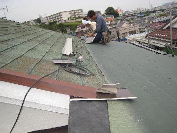 コロニアル葺きの改修状況です。左側が既存の屋根ですが、屋根材の表面の塗膜が劣化しています。塗膜が劣化すると屋根材の防水性能、屋根材の強度に影響を及ぼします。5年から7年程度で塗り替えをしていくのが理想的です。劣化がすすむと屋根の下地にも影響します、屋根材の葺き替えが必要になる場合もあります。信頼できる業者へ連絡し、早期のメンテナンスをおすすめ致します。