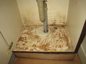 洗面化粧台の排水管より漏水があり、化粧台床板が腐食しています。荷物があり気が付かないことが多いようですが、大掃除の時などに確認してみてください。水やお湯の栓もこの部分にあり、締め付けがゆるむとやはり水が漏れます。放っておくと床板まで腐食してしまいます。さわってみて濡れているようなら、専門業者に確認してもらうことをおすすめ致します。