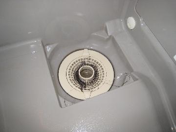 ユニットバスの排水口です。髪の毛などが詰まると排水の流れが悪くなります。目皿(髪の毛などをキャッチする網状の蓋)の掃除は1〜2週間に1回は行ってください。髪の毛や石けんかすが、排水の配管で詰まると補修が大変ですので、そうなる前にこまめに清掃することをおすすめ致します。